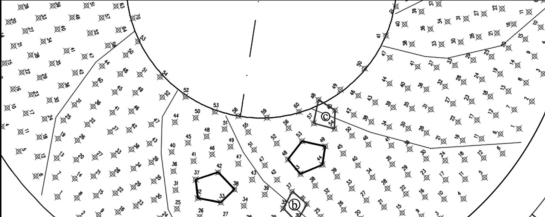 7)在堤头圆弧段或拐弯带安放时,由于堤脚处半径比堤顶的大,随着扭王字块安放逐渐接近堤顶的过程中,其分布菱形网格逐渐变形,在局部区域甚至出现剩余空间过小、很难安放一个完整扭王字块体的情况,此位置的扭王字块体将不得不舍弃掉,形成一个不规则五边形(如图5)。尽管这种局部舍弃块体的情况是被允许的,但在施工中应当尽量避免这种不规则的五边形布置连续岀现。