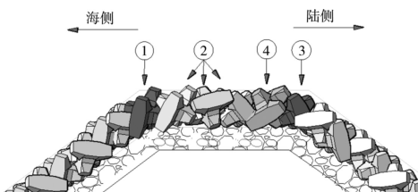 堤顶安放:防波堤两侧块体完全安放完毕后,可开始堤顶的安装工作。水平段扭王字块的安放没有具体的点位要求。安放过程中只须保证所有块体接触紧密,达到更大的安放密度即可。从断面图(图6)上来看,施工时应当首先安放海侧斜坡与水平段的①部分的块体,然后向陆侧安放②部分的块体,随后安放陆侧斜坡与水平段相交接的③部分块体,最后安放④部分的块体,用于连接两侧的块体。