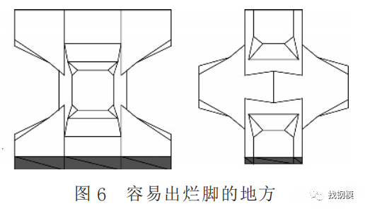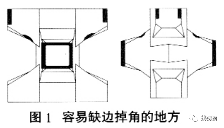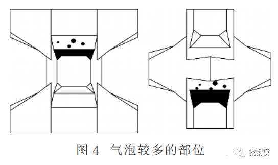 扭王字块有6个肢杆, 而且不全在同一平面,几何形状比较复杂, 通常出现的表面缺陷种类相对较多, 有边棱掉角、砂斑、砂线、气泡、烂脚等, 这些缺陷不一定都同时出现, 表面缺陷成因各不相同, 要改善缺陷, 必须找出最根本原因,才能采取相应措施、对策。但是,表面缺陷的成因并不容易找, 既要通过理论分析, 也要在生产实践中不断地试验、总结, 直到找出成因。