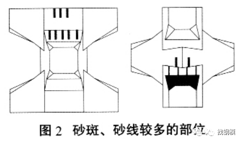 1) 构件的腰部和下肢顶面有较大面积的砂斑砂线, 构件上部的垂直面中间和小斜面有时也有砂线(图2)。