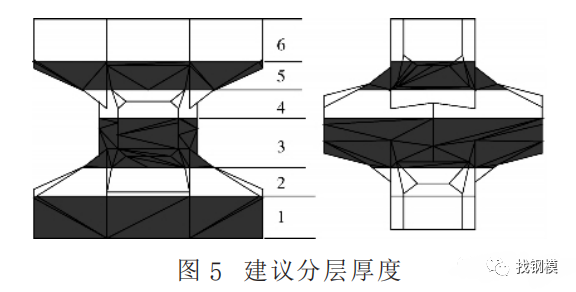 2) 根据构件高度(5t:h=1.875m, 7t:h=2.097 m, 9t:h=2.281 m) 和形状, 分5~6层浇注 (图5) , 保证每层厚度不超过50cm。尤其浇注下肢和中肢斜面部分时,分层太厚, 积聚在斜面的气泡很不容易振出来。